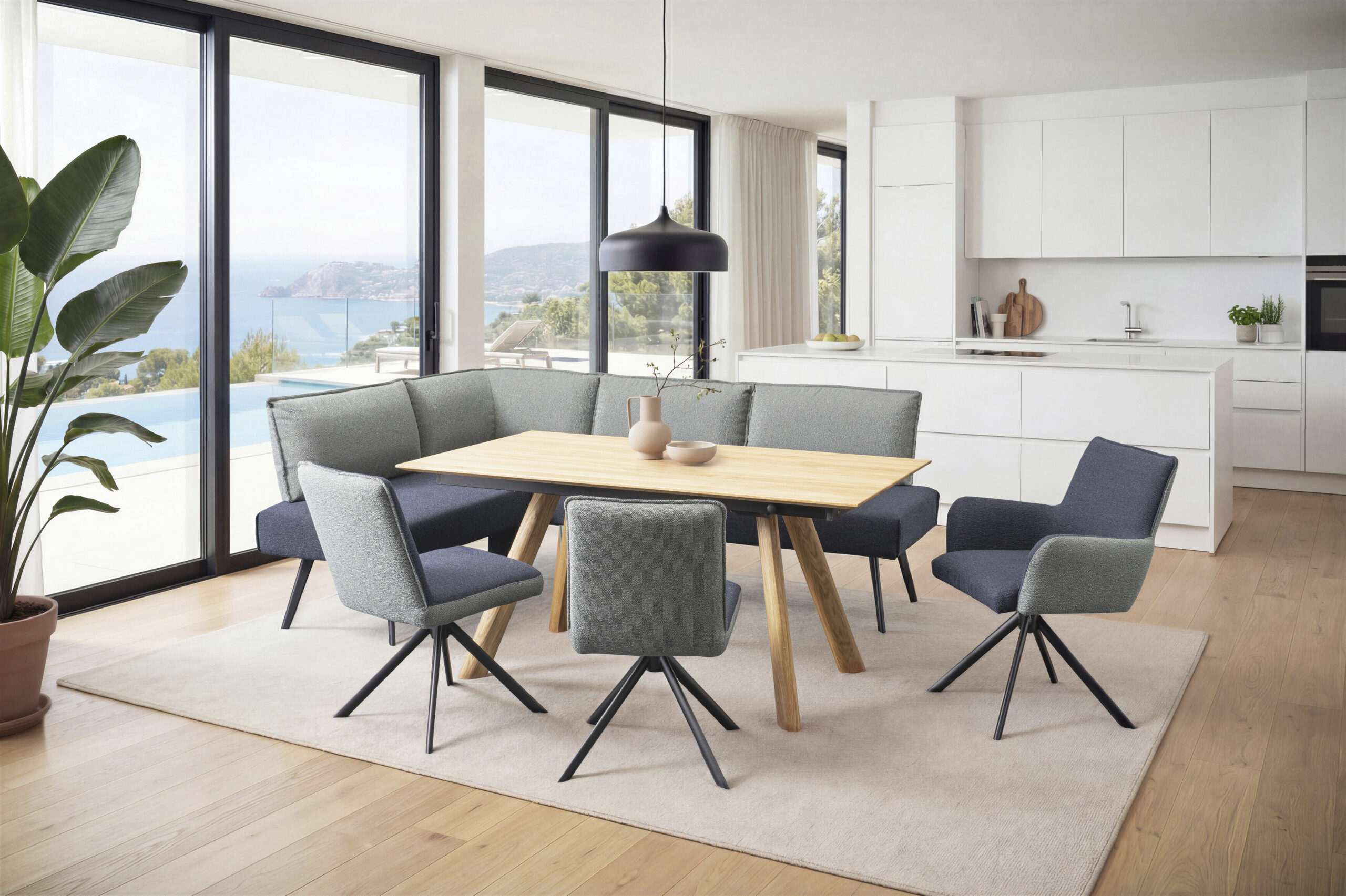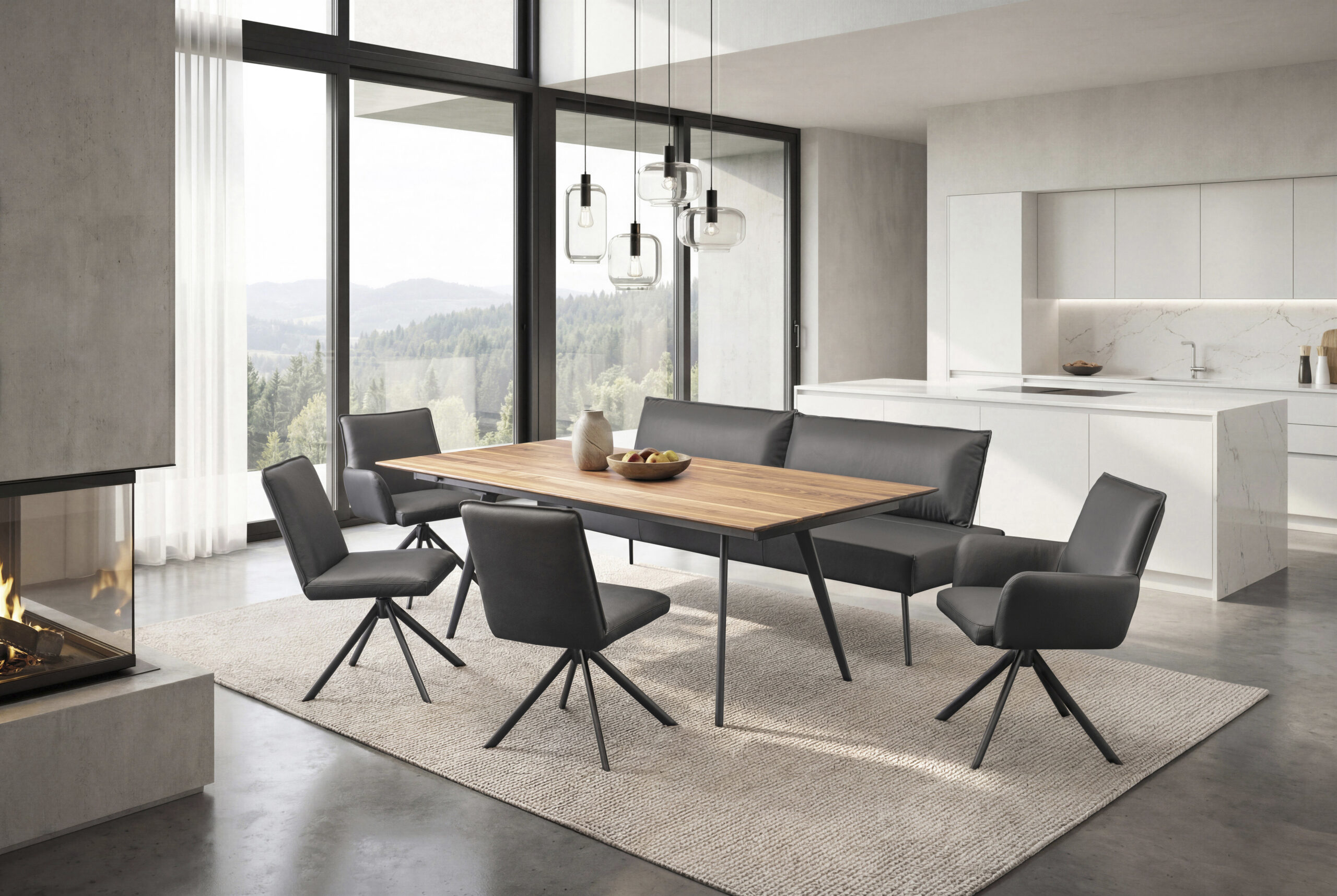 Zeitlose Eleganz trifft auf modernen Komfort – gestalten Sie Ihr Zuhause mit diesem stilvollen Esszimmer-Ensemble aus edlem Holz und geschmackvollen Akzenten!