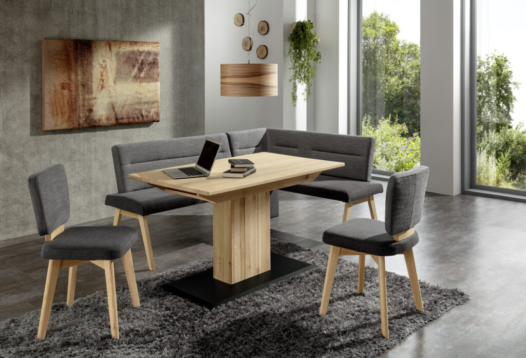 Das Eckbankprogramm Smart Corner bietet zwei verschiedene Stühle. Den Stuhl links mit einem schwarzen Kufenuntergestell, oder einem Melkschemel-Untergestell aus massiver Eiche. Die beide Stühle zeichnen sich wiederum durch ihre geringe Breite und Tiefe aus, womit die Stühle in engen Räumen sehr platzsparend sind.